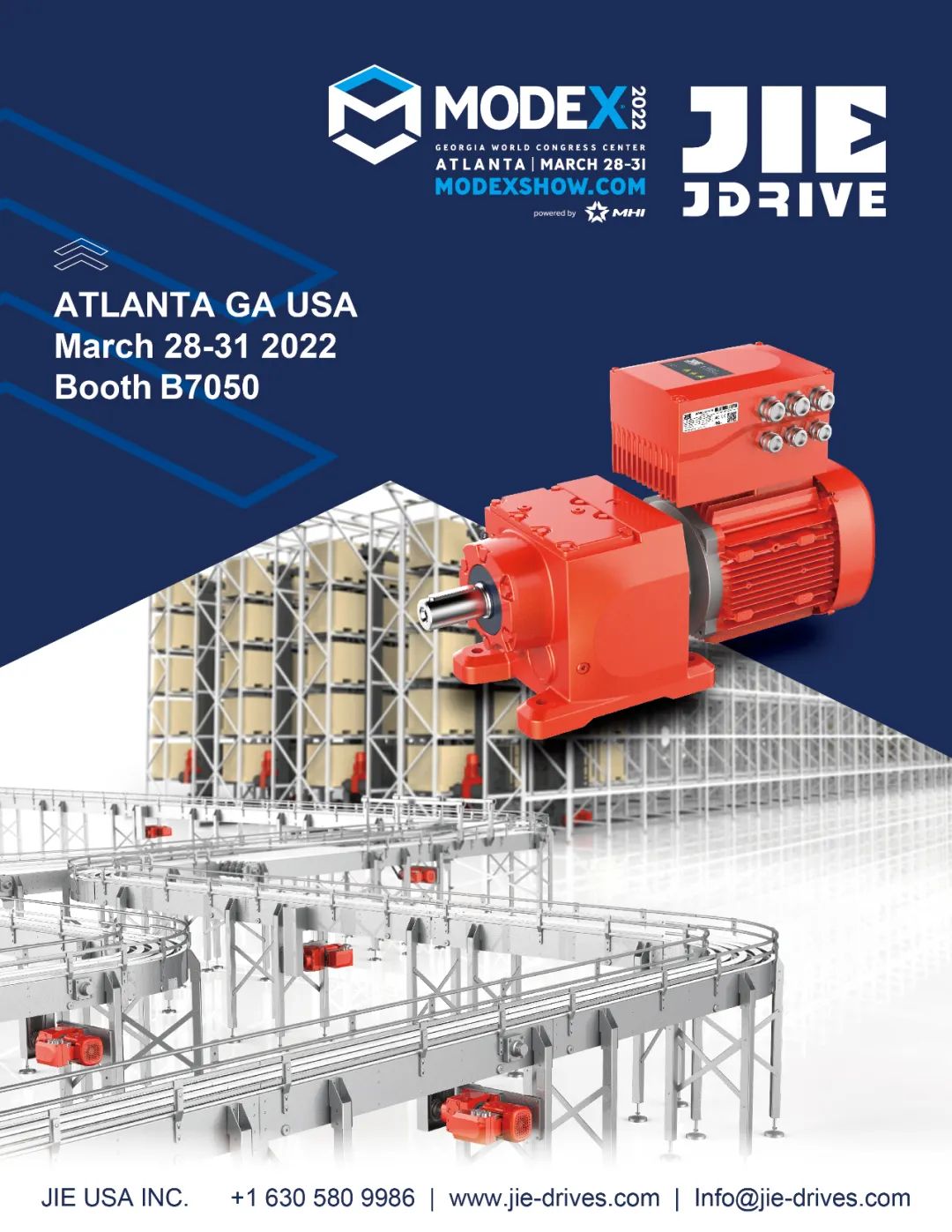 2022年3月28-31日,杰牌美國公司亮相美國亞特蘭大運輸物流MODEX展覽會,運輸物流行業—杰牌智能傳動方案提供商。